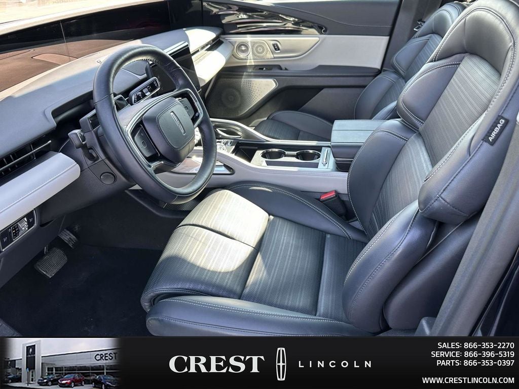 Cargo Accessories & Mat Package (All-Weather Floor Liner, Cargo Area Protector, and Cargo Net), Equipment Group 203A (110V Power Converter, Auto Air Refresh, Digital Scent, Hands-Free Power Liftgate, Lincoln BlueCruise Equipped (4-Years Included), Panoramic Vista Roof, Premium Lthr-Trmmd Heated/Ventilated Comfort Seats, Radio: AM/FM/HD w/Revel Ultima Audio System, and Rear Heated Seats w/Switch Control), Jet Appearance Package (87T) (Black Exterior Elements, Body Color, and Wheels: 22 Satin Dark Luster Nickel), 10 Speakers, 3.81 Axle Ratio, 360 Degree Camera, 4-Wheel Disc Brakes, ABS brakes, Active Park Assist 2.0, Adaptive suspension, Air Conditioning, Alexa Built-In, Alloy wheels, AM/FM Radio, AM/FM radio: SiriusXM with 360L, Apple CarPlay/Android Auto, Auto High-beam Headlights, Auto tilt-away steering wheel, Auto-dimming Rear-View mirror, Automatic temperature control, Blind Spot Info. System w/Cross-Traffic Alert, Brake assist, Bumpers: body-color, Compass, Delay-off headlights, Driver door bin, Driver vanity mirror, Dual front impact airbags, Dual front side impact airbags, Electronic Stability Control, Emergency communication system: 911 Assist, Exterior Parking Camera Rear, Four wheel independent suspension, Front anti-roll bar, Front Bucket Seats, Front Center Armrest w/Storage, Front dual zone A/C, Front reading lights, Fully automatic headlights, Garage door transmitter: HomeLink, Heated door mirrors, Heated front seats, Heated steering wheel, Illuminated entry, Intelligent Adaptive Cruise Control, Knee airbag, Leather steering wheel, Lincoln BlueCruise Equipped (90-Day Trial), Low tire pressure warning, Lthr w/Suede Inserts Htd/Ventilated Comfort Seats, Memory seat, Navigation System, Occupant sensing airbag, Outside temperature display, Overhead airbag, Overhead console, Panic alarm, Passenger door bin, Passenger vanity mirror, Power door mirrors, Power driver seat, Power Liftgate, Power passenger seat, Power steering, Power windows, Prem Lthr-Trimmed Heated/Ventilated Captain Seats, Radio data system, Rain sensing wipers, Rear anti-roll bar, Rear reading lights, Rear seat center armrest, Rear window defroster, Rear window wiper, Remote keyless entry, Security system, Speed control, Speed-sensing steering, Speed-Sensitive Wipers, Split folding rear seat, Spoiler, Steering wheel memory, Steering wheel mounted audio controls, Tachometer, Telescoping steering wheel, Tilt steering wheel, Traction control, Trip computer, Turn signal indicator mirrors, Variably intermittent wipers, Ventilated front seats, and Wheels: 21 Ultra Bright Machined Aluminum.